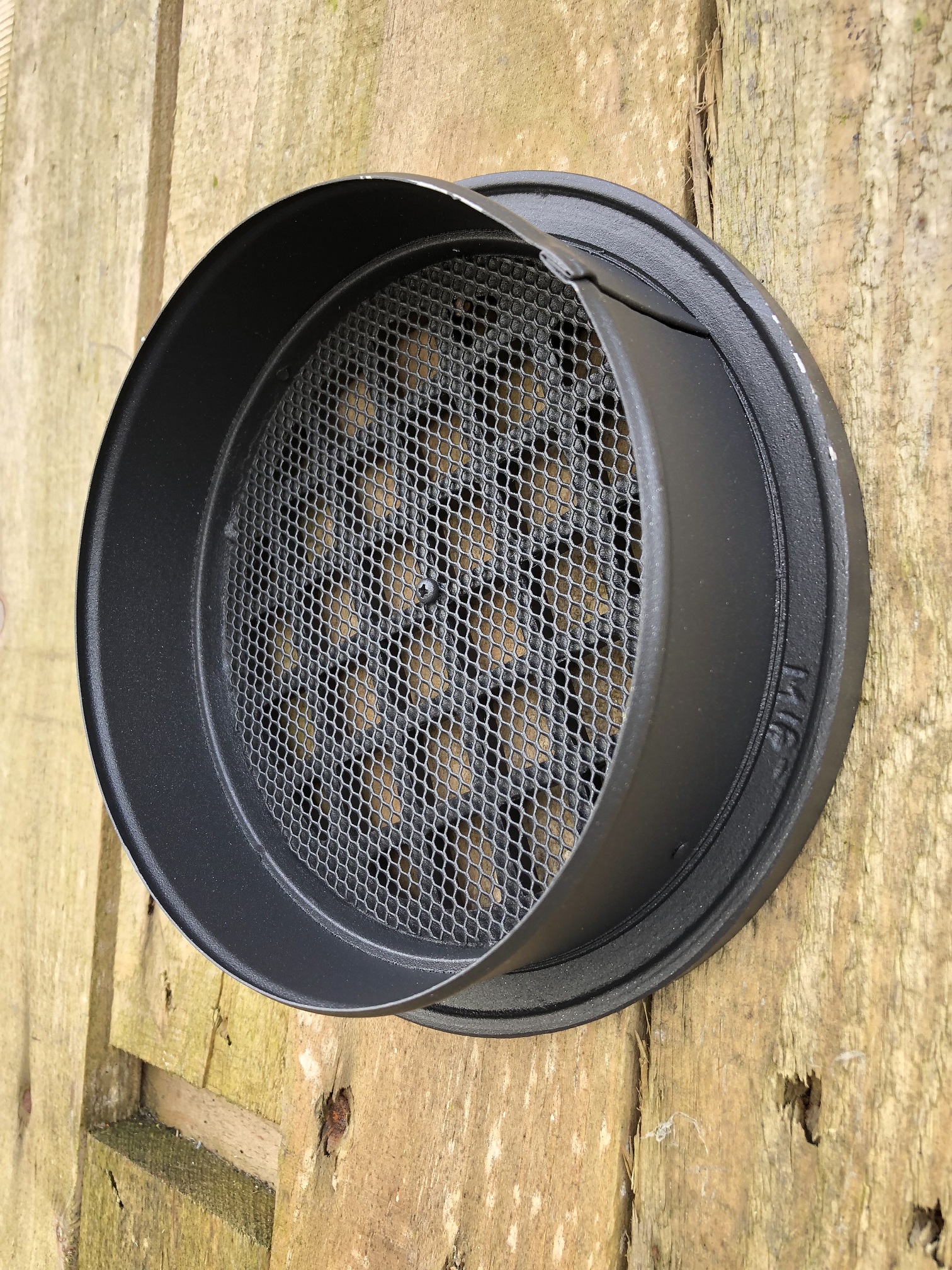 Mooi openhaard lucht rooster van aluminium zwart met vlieggaas als bescherming tegen insluip van ongewenste insekten.