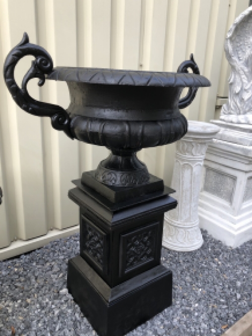Gusseiserne Vase auf gusseiserner Säule, schwer und robust-schwarz.