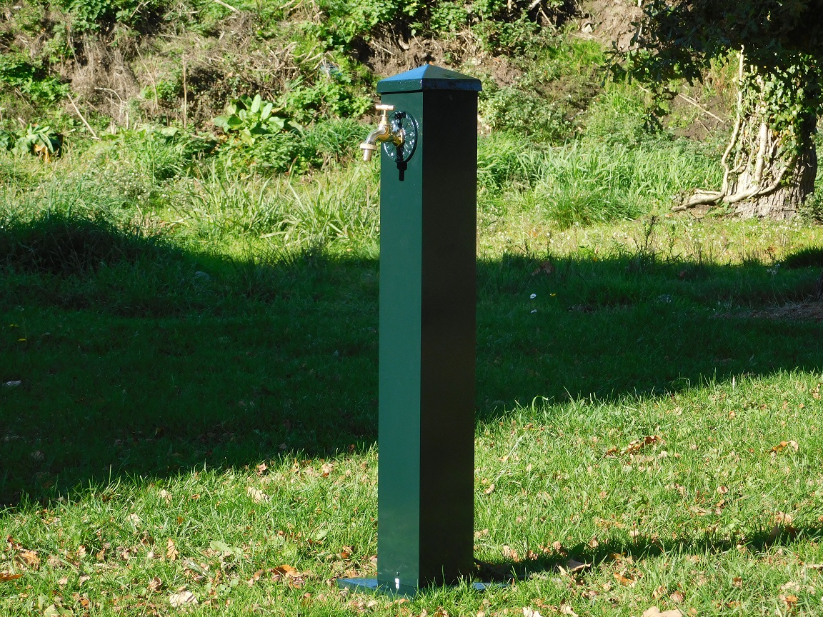 Dieser Standbrunnen wird mit einem Kupferhahn geliefert und ist wetterfest.