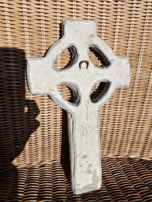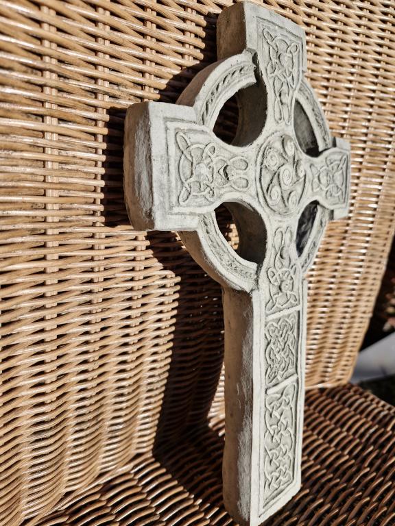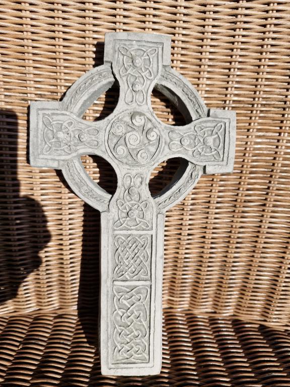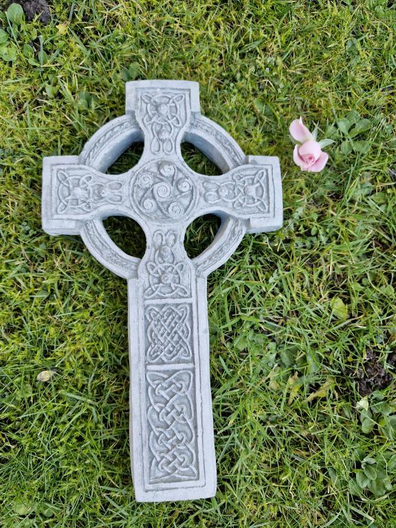 Dieses wunderschöne keltische Kreuz aus Beton ist reich verziert mit authentischen keltischen Knotenmotiven und einem eleganten Kreis, der Ewigkeit und Verbundenheit symbolisiert.