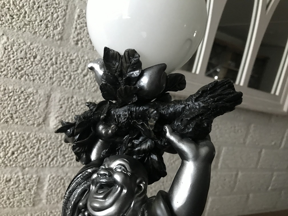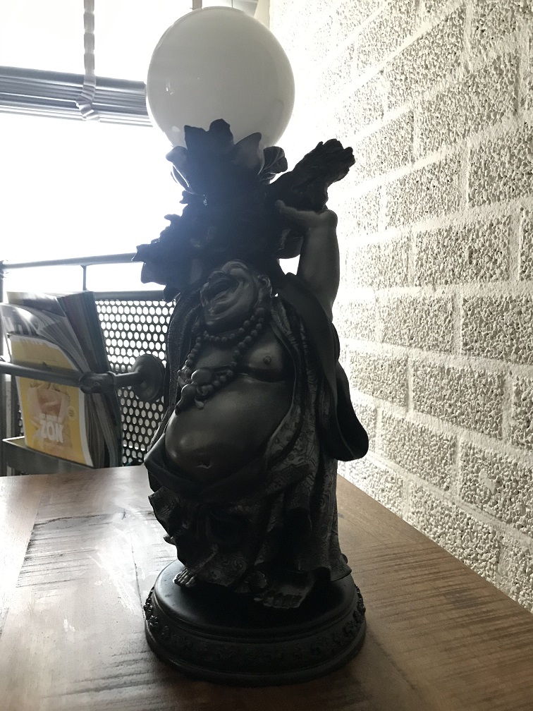 Buddha-Lampe, ganz besondere und exklusive Lampe in Form eines Buddhas, der die Kugel hält