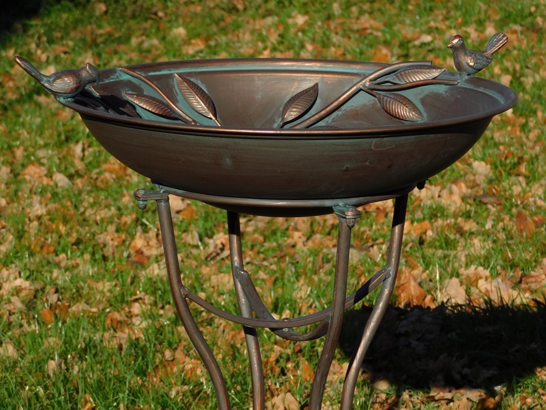 Das eiserne Design in bronzefarbener Ausführung mit dezenten grün-blauen Patina-Akzenten verleiht dem Vogelbad einen charmanten Vintage-Look, der sowohl zu klassischen als auch zu modernen Gärten passt.