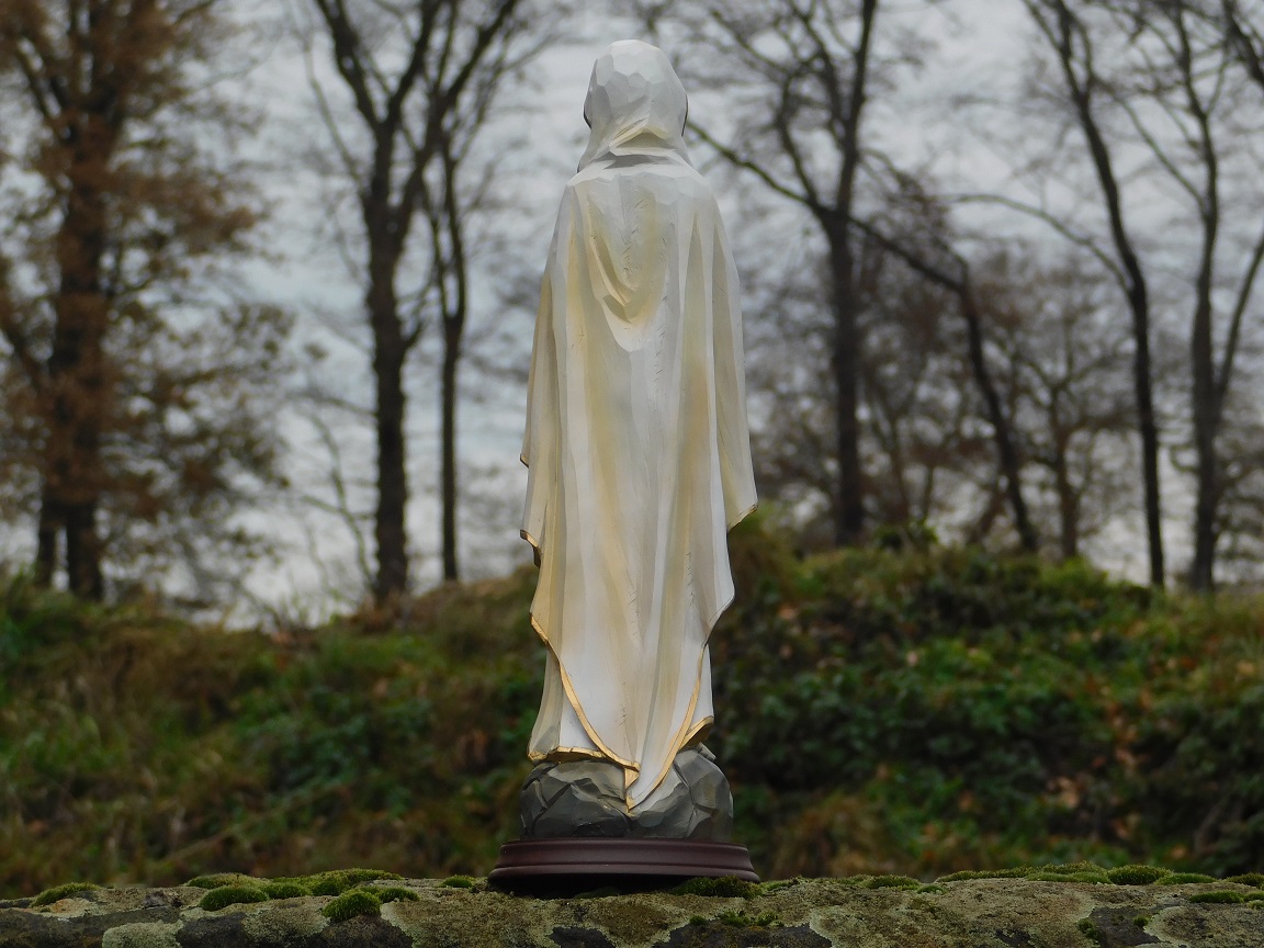 Diese schöne Marienstatue ist aus Polystone, einem haltbaren und robusten Kunststoff, gefertigt. Die Statue zeigt Maria mit einem wunderschönen Rosenkranz um den Arm und ist eine perfekte Ergänzung für jeden Andachtsraum oder jede Sammlung.