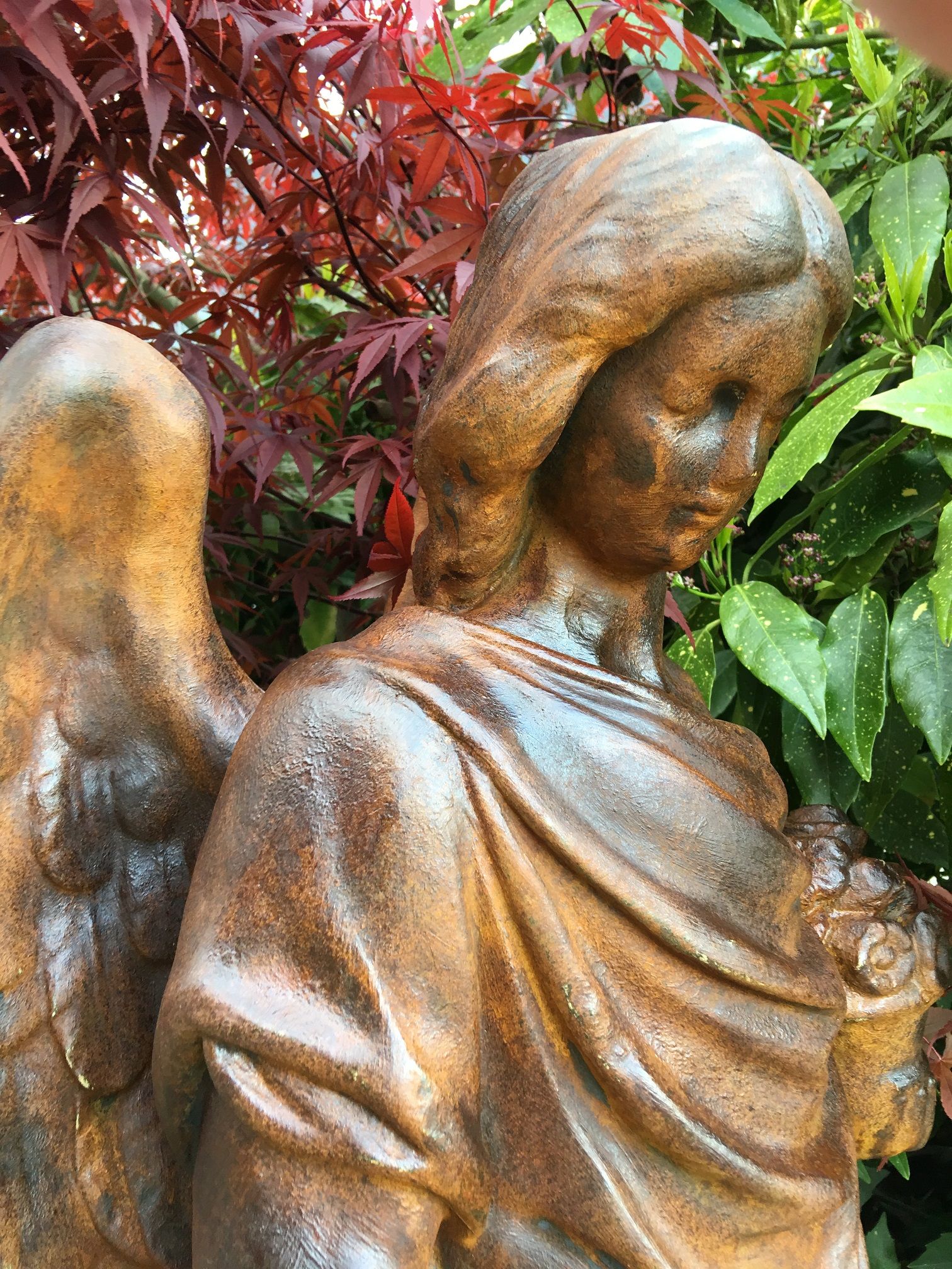 Diese schöne Statue eines stehenden Engels in Oxid ist eine beeindruckende Ergänzung für jeden Garten oder Außenbereich.