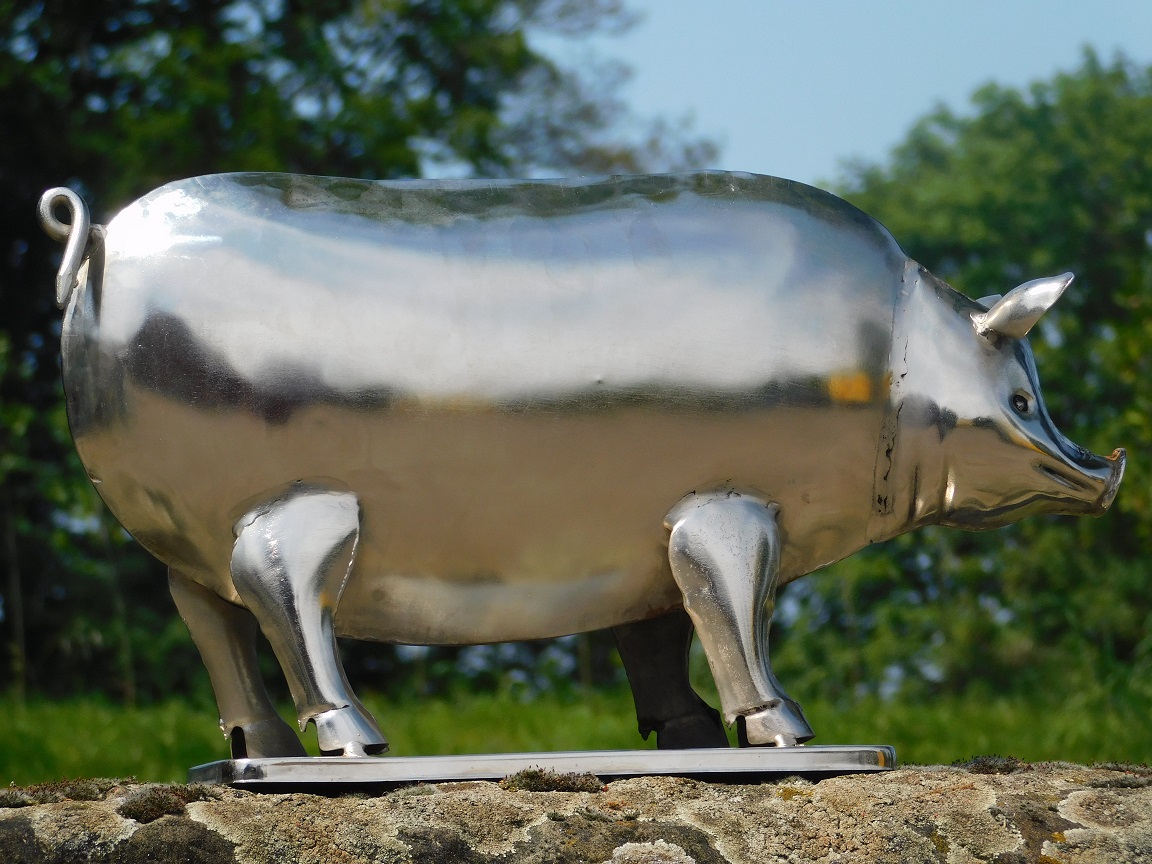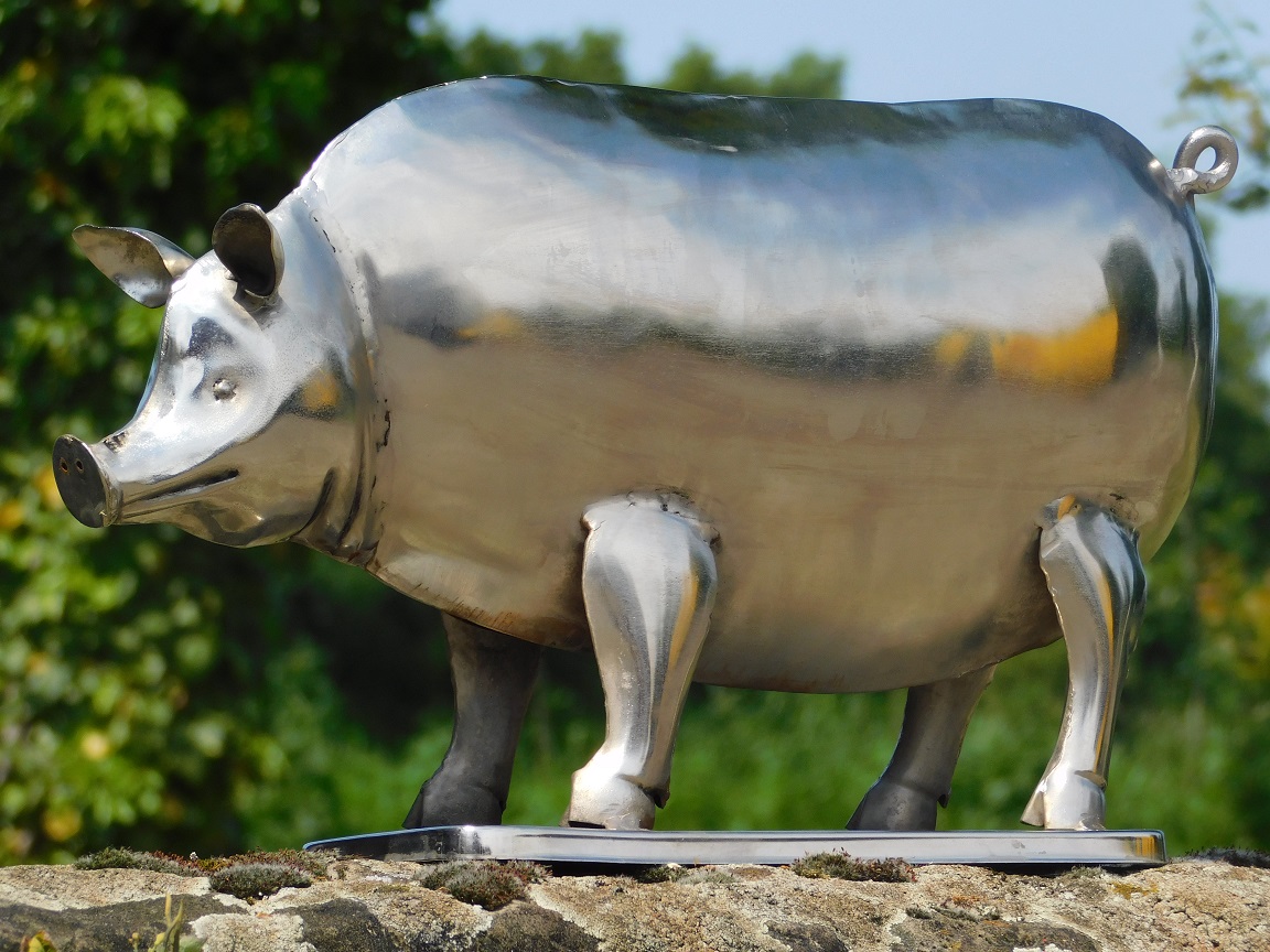 Diese Schweineskulptur aus Metall ist ein perfektes Geschenk für Kunst- und Tierliebhaber.