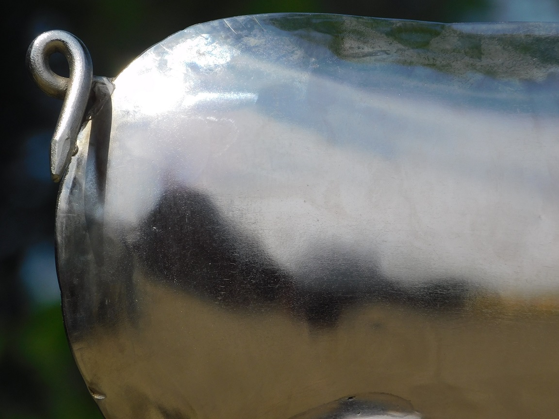 Mit ihrem modernen Look und der chromfarbenen Oberfläche ist diese Skulptur ein auffälliges Dekorationsstück, das sofort die Aufmerksamkeit auf sich zieht.