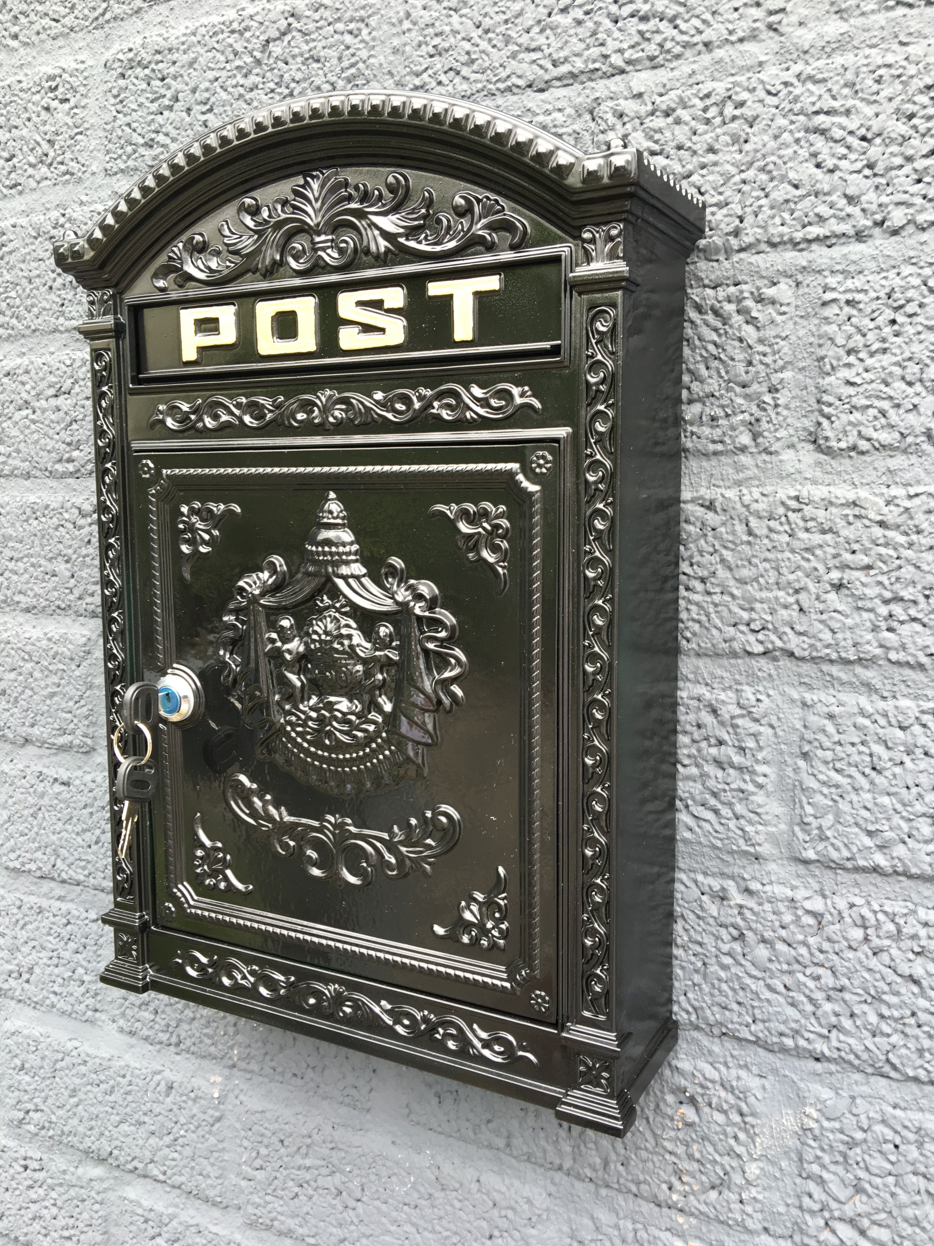 Mailbox Londen, zwart van aluminium en: een historisch Engelse muur mailbox.