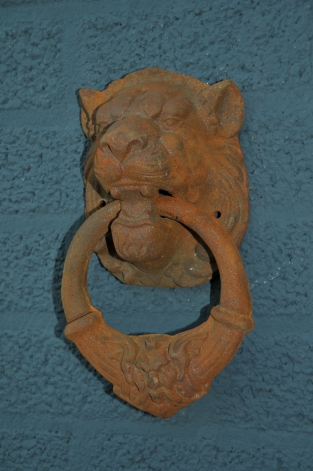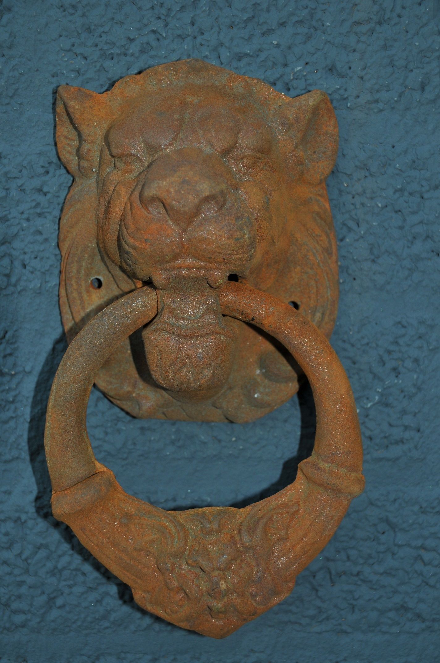 Antiek gesmede deurklopper voor poorten met het hoofd van een indrukwekkende leeuw en een grote, stevige ijzeren ring.