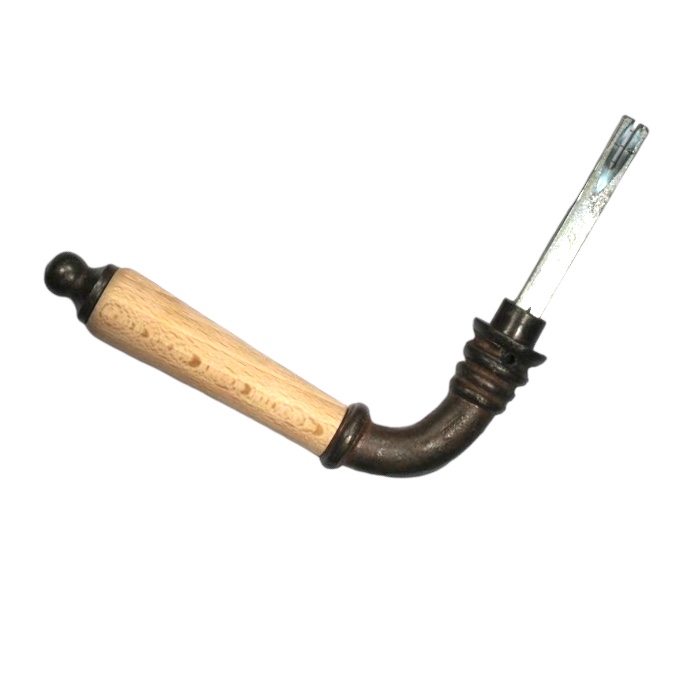 Een antieke deurklink, gemaakt van ijzer, met een houten handvat. Het ijzer heeft een geroest oppervlak en het houten handvat is gemaakt van beuk. Perfect in een historische en nostalgische ambiance.