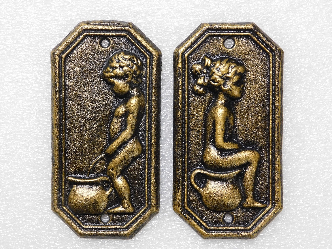 Deze set gietijzeren toiletbordjes is ideaal voor elke plek waar bezoekers direct moeten kunnen zien waar het toilet is.
