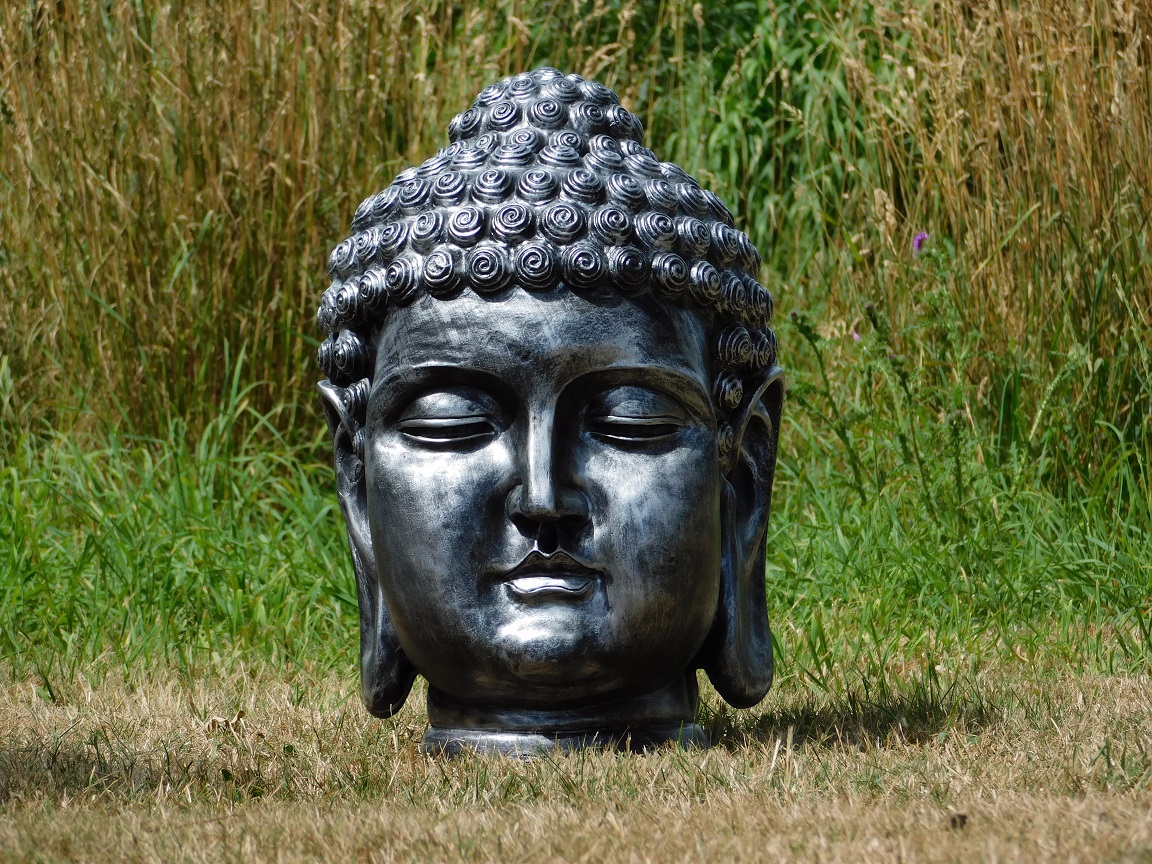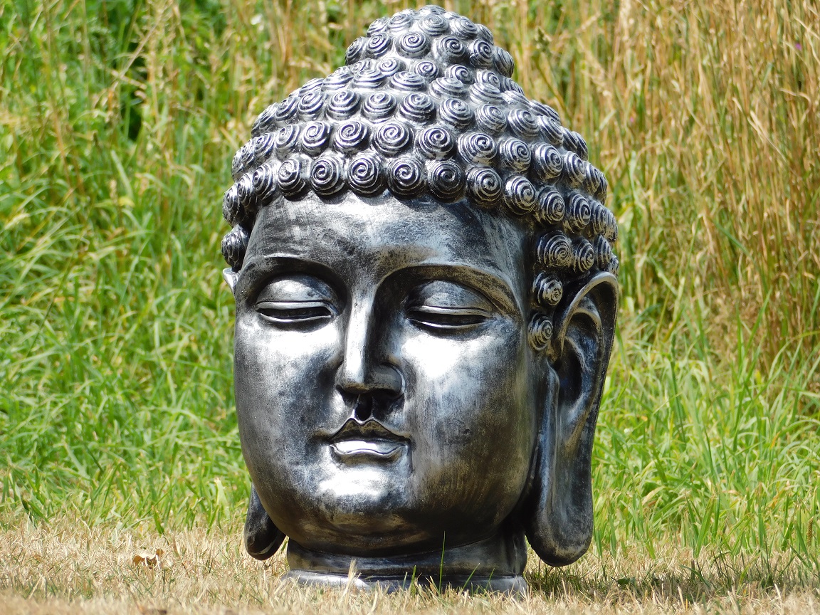 Leveringsomvang: 1 x boeddhahoofd polystein ziler-grijs.