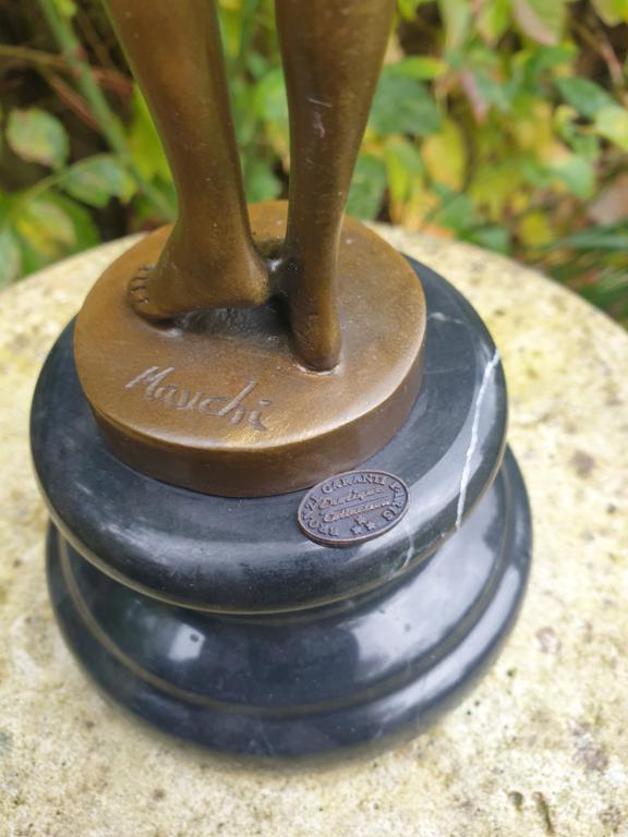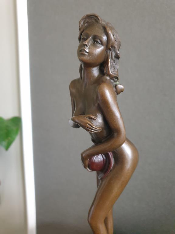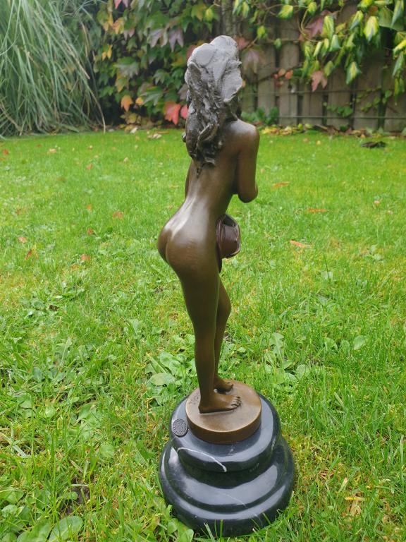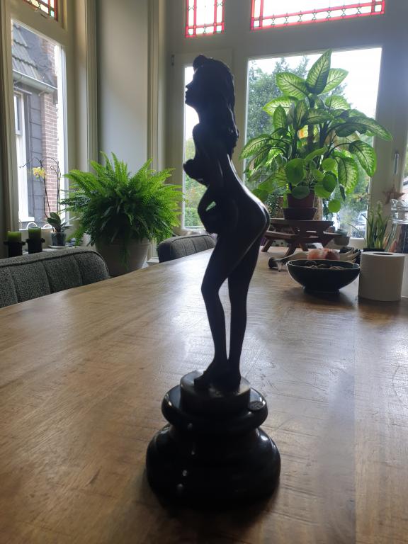 De sierlijke dame is uitgebeeld in een sensuele, maar stijlvolle houding, geplaatst op een ronde marmeren console die het beeld extra allure en balans geeft.