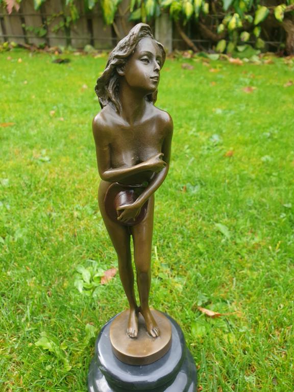 Een prachtig en verfijnd bronzen beeld van een vrouwelijke figuur met een ondeugende houding en een hoed die speels haar vormen bedekt .