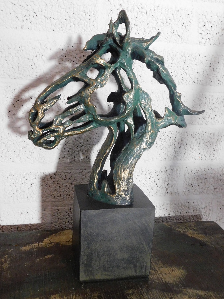 Voeg een uniek artistiek element toe aan je interieur met dit prachtige abstracte beeld van een paardenhoofd.