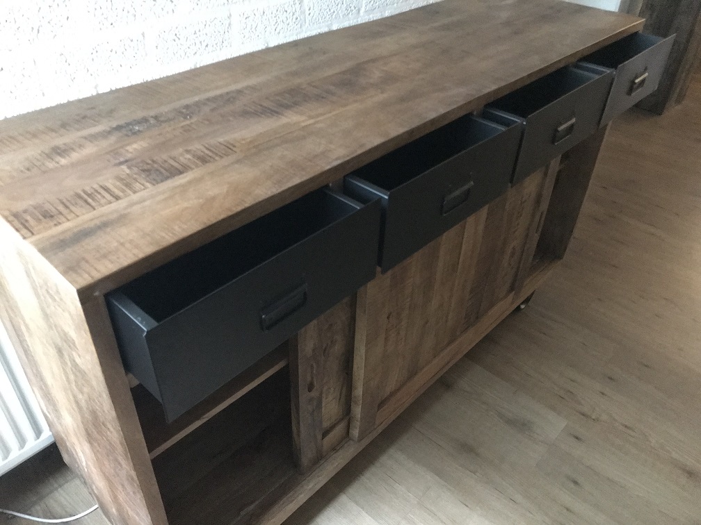 Mooi zwaar dressoir van goede kwaliteit. Het bevat 4 metalen lades en 2 houten schuifdeuren. Dit dressoir bevat ook 4 ijzeren wielen.