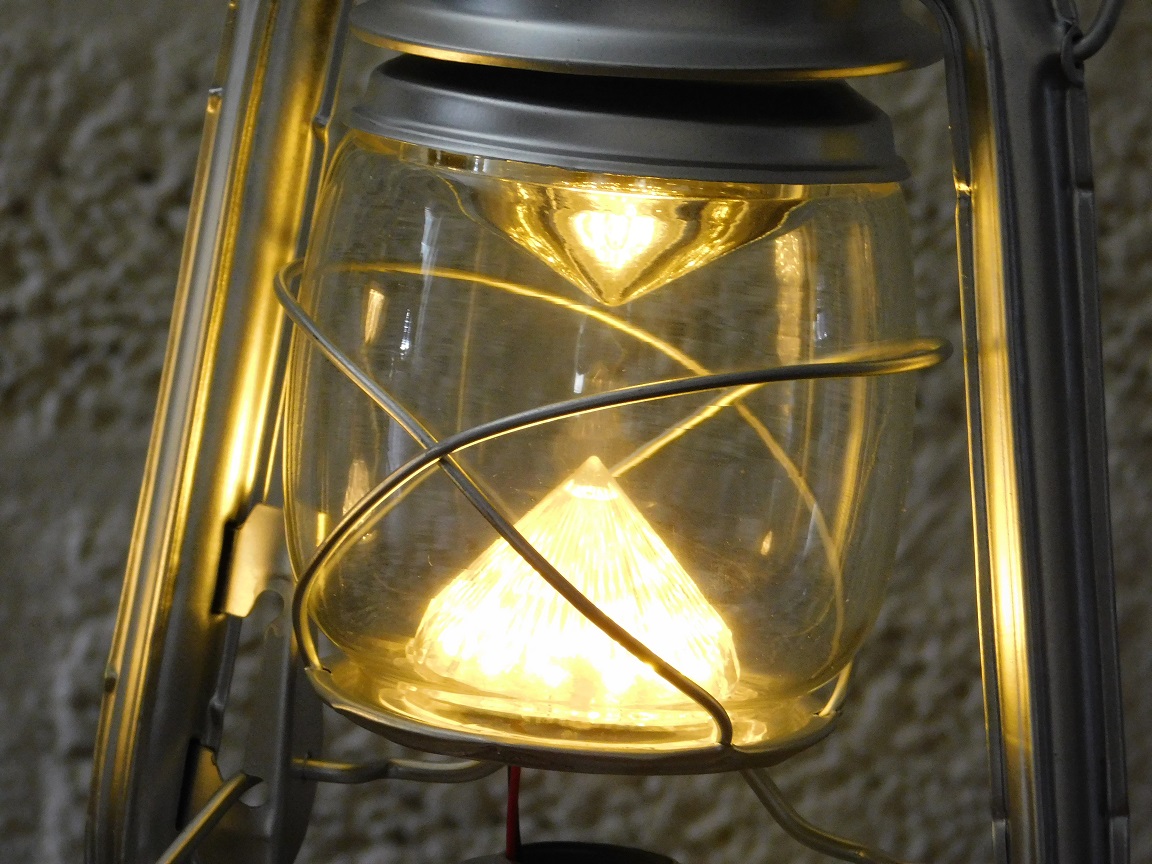 Mooi gedaan: een antieke olie storm lamp in een modern jasje en voorzien van een led lamp, de ouderwetse vulopening fungeert nu als aan en uit knop. Deze lamp functioneert op 4 AA-batterijen (niet inbegrepen).