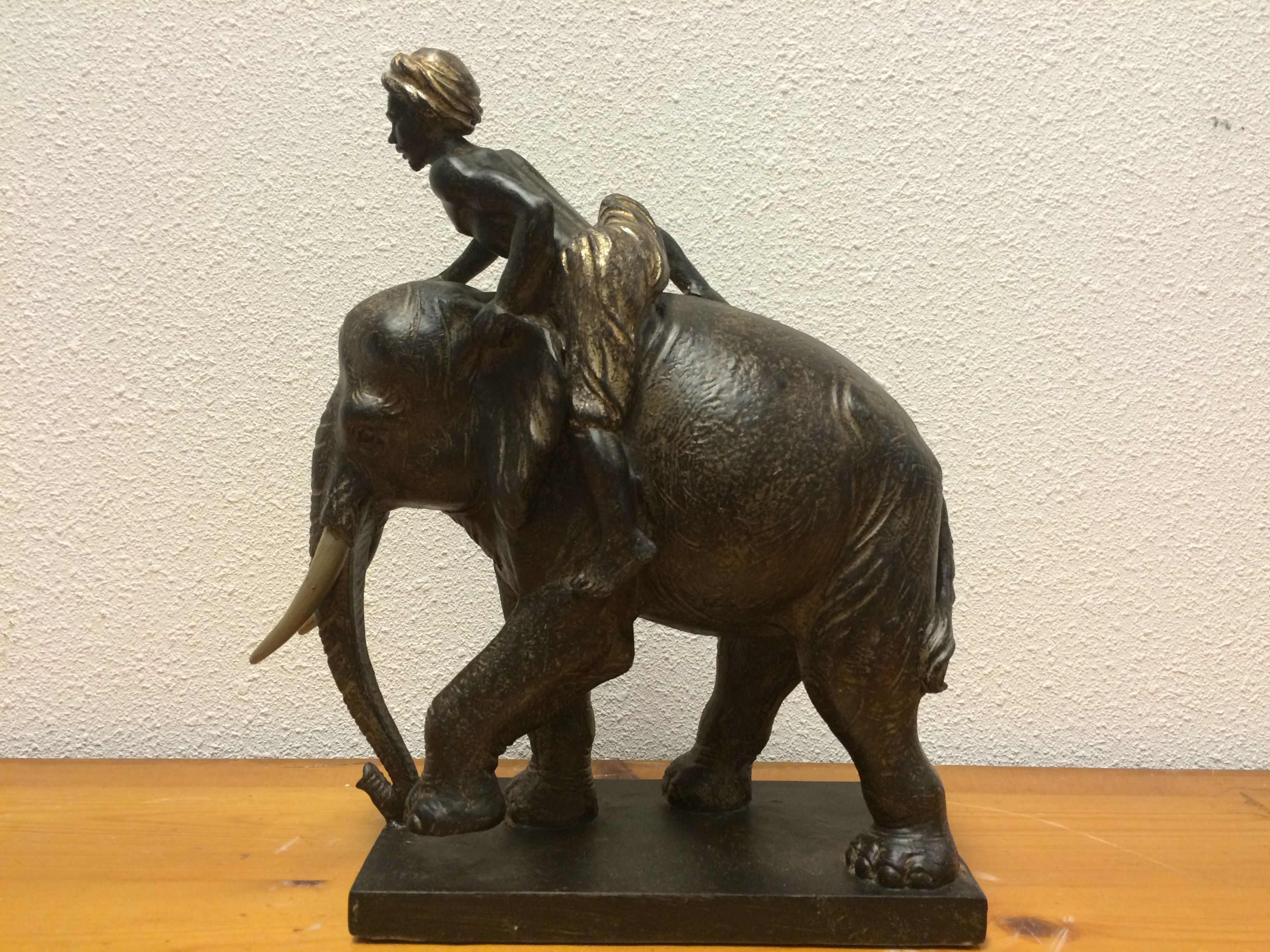 Ein faszinierend gestaltetes Schreibtisch-Objekt: Die hervorragende Idee eines sich im Aufsprung befindlichen Reiters, ist hier absolut lebensecht dargestellt Der kleine Mensch beherrscht den riesigen Elefanten. Auch hier originalgetreu - der indische Elefant seinerseits in einer Schrittbewegung gezeigt. Hierdurch entsteht eine überzeugende Lebendigkeit, derentwegen, man sich nur schwer vom Anblick dieser schönen Skulptur abwenden kann. Auch auf der Terrasse oder im Bad eine phantastische Dekoration mit ganz besonderer Ausstrahlung!