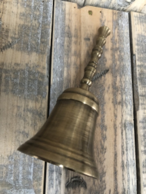 Messing bel + handvat, elkaar perfect aanvullen in deze bel. Stijlvol en elegant, tijdloos, en goed klinkende bel, zowel als klok van een schip, of als tafel klok geschikt.