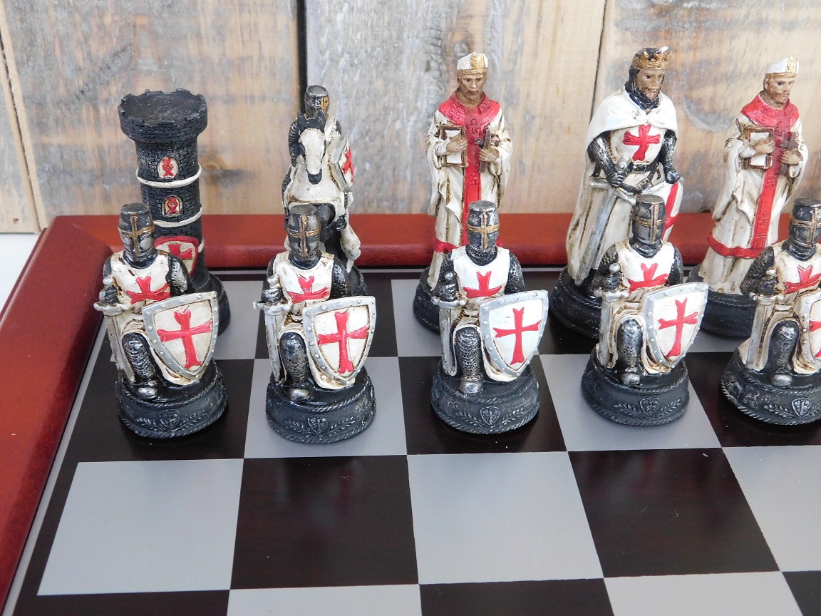 De schaakstukken zijn helemaal in het thema van de middeleeuwen en haar ridders. Dit schaakspel bestaat dus uit die bijzondere schaakstukken en uit een schaakbord.