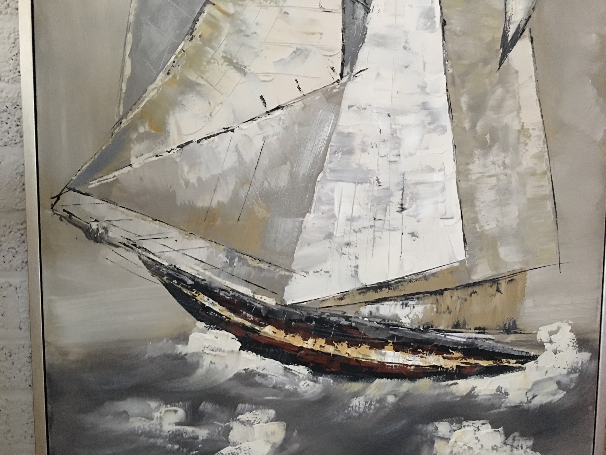 Dit is een opvallend groot schilderij van een zeilschip, origineel olieverf schilderij geschilderd op linnen Opgespannen op dik spieraam en in een aluminium geschuurde lijst geplaatst.