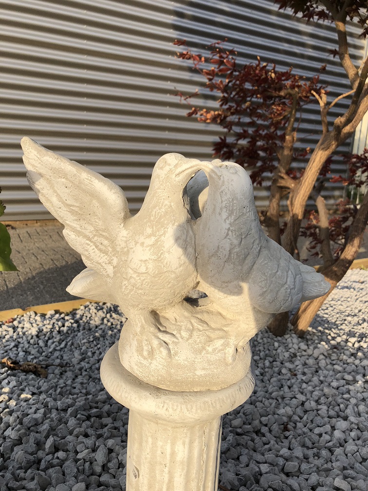 Prachtig stenen beeld van 2 duiven op stenen sokkel, mooi voor in de tuin of op het terras.