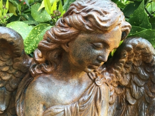 Engel knielend, mooie donkere kleuren, vol stenen oxid, zwaar beeld.