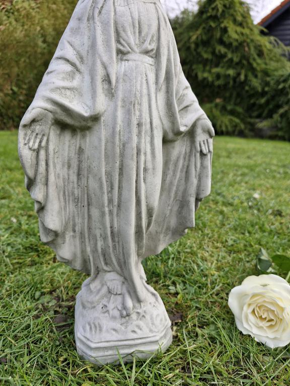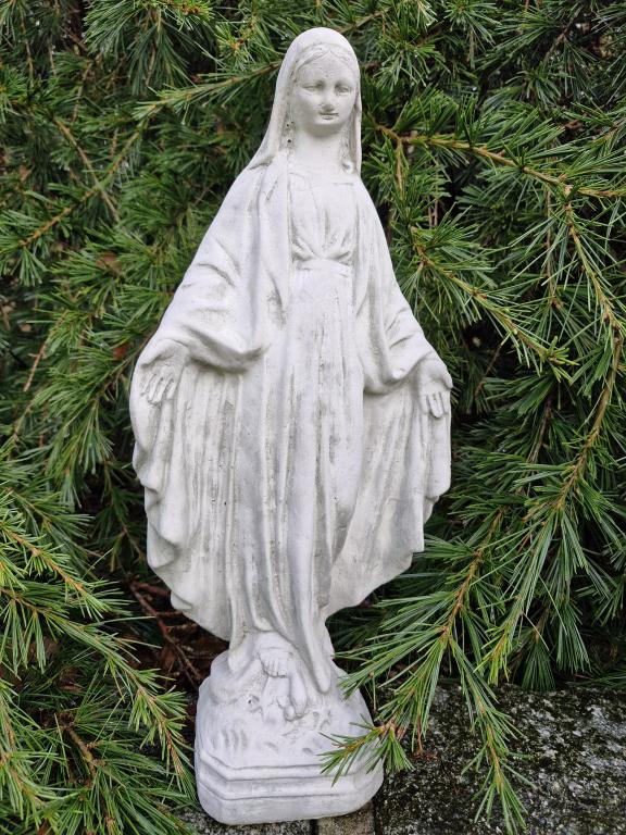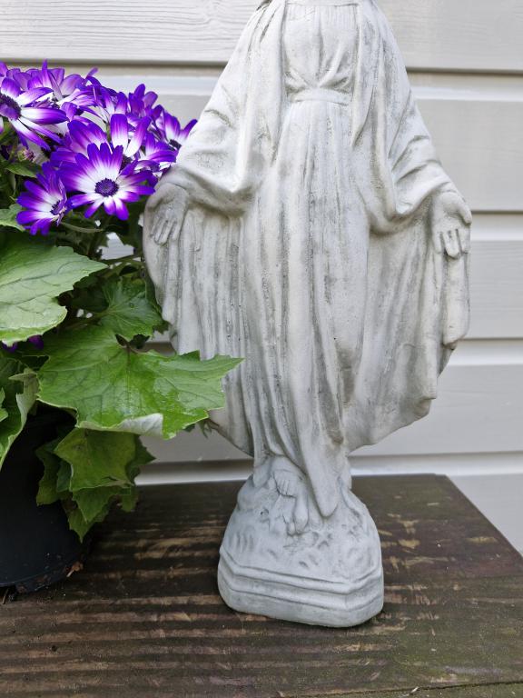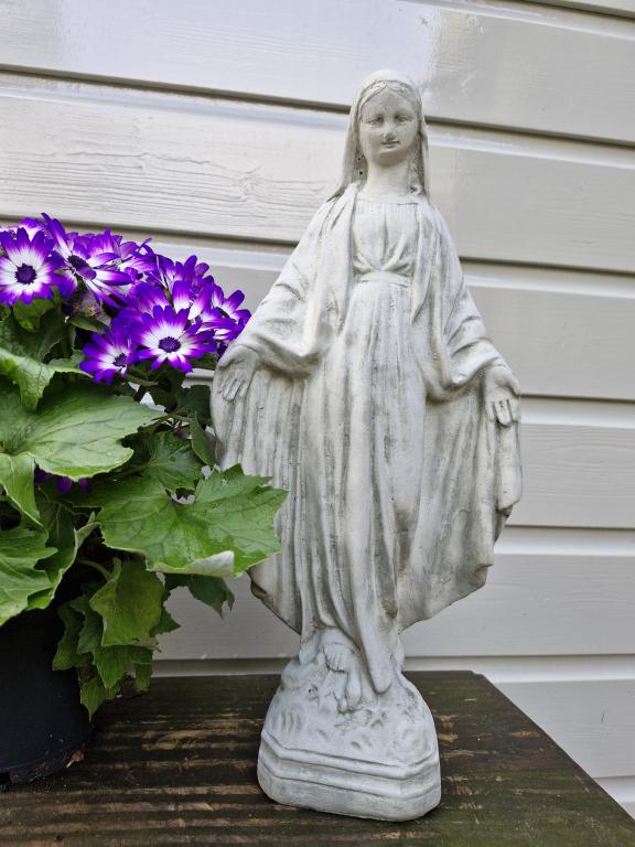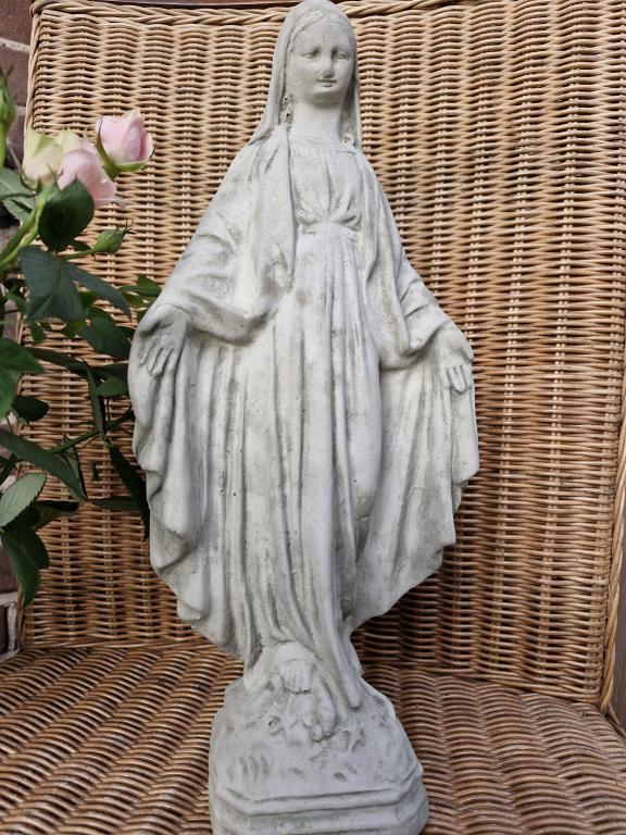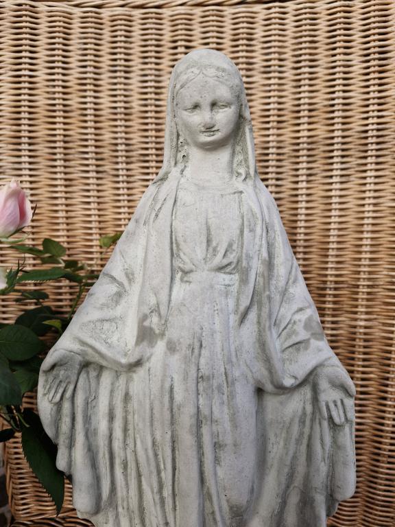Maria beeld in natuurlijke, lichte kleur  ( oud wit ). Door de rustige vormgeving past dit beeld zowel binnen als buiten.