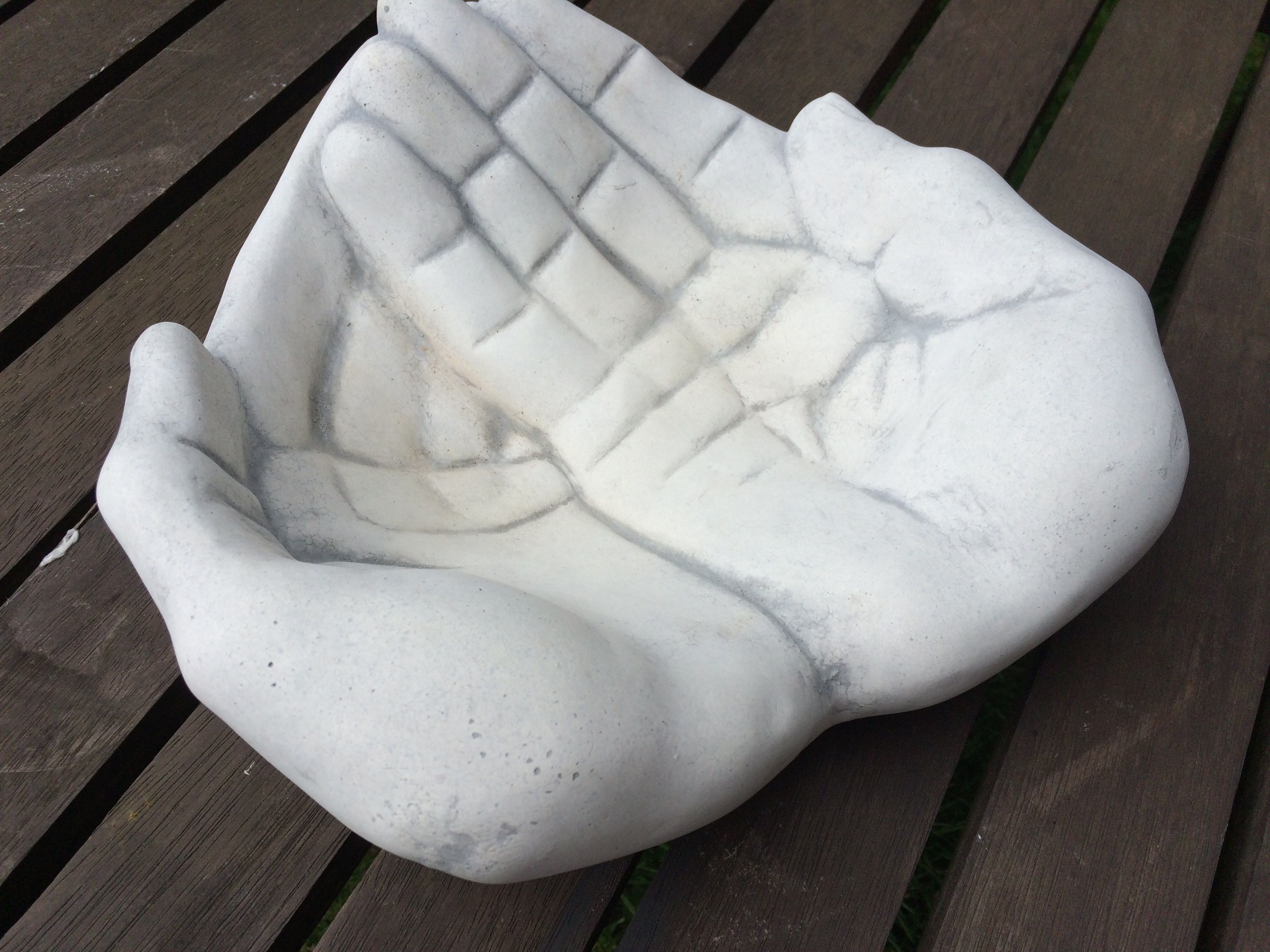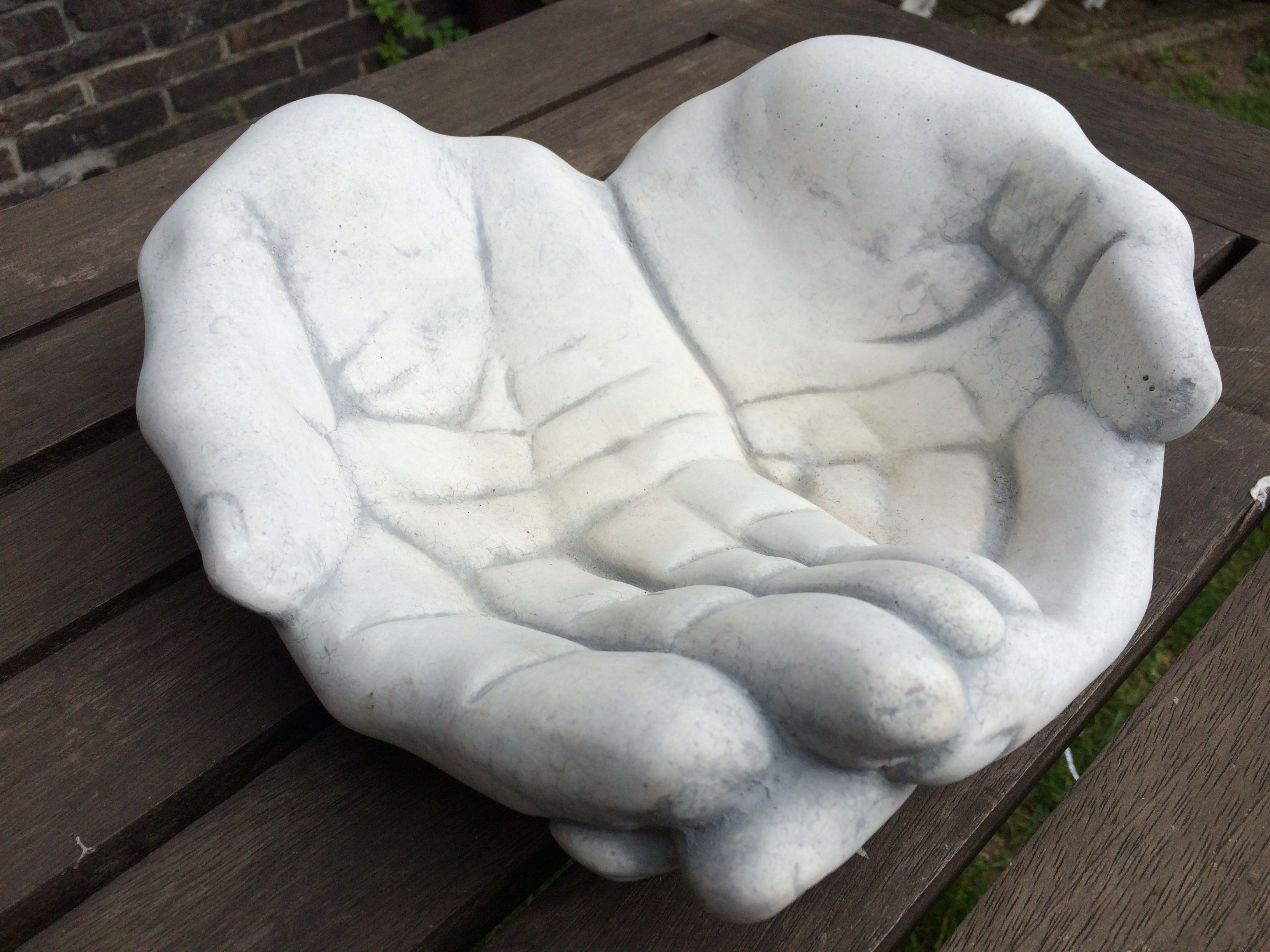 Deze vol stenen handen zijn prachtig in ontwerp en kunnen dienen als b.v. vogelbadje in de tuin, als plantenschaal of