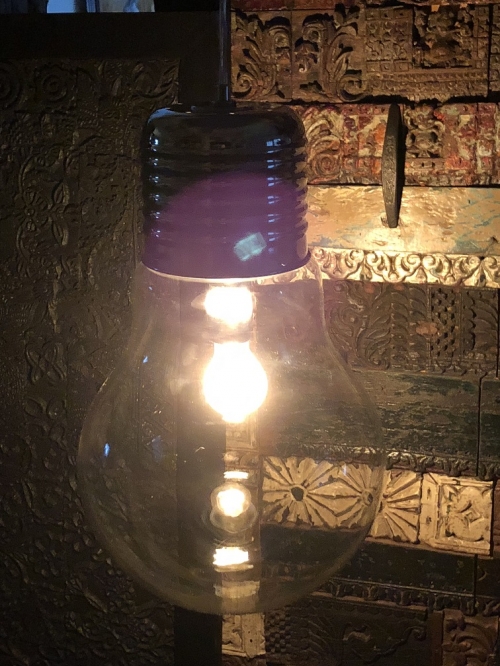Hanglamp in de vorm van een hele grote gloeilamp, zeer mooi om te zien.