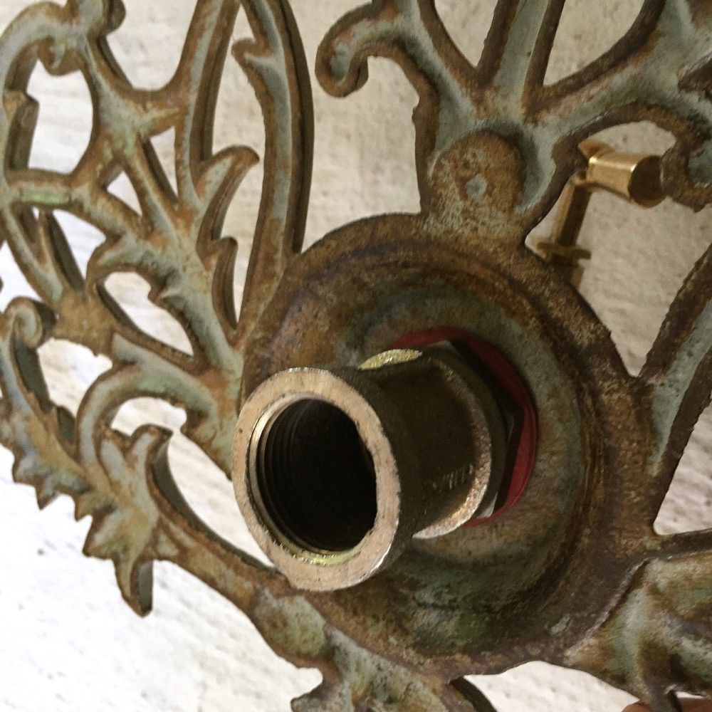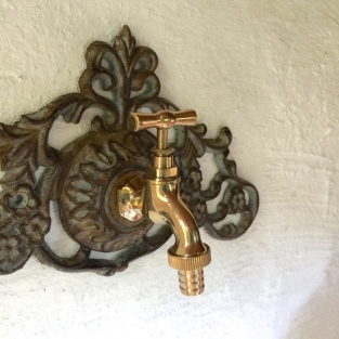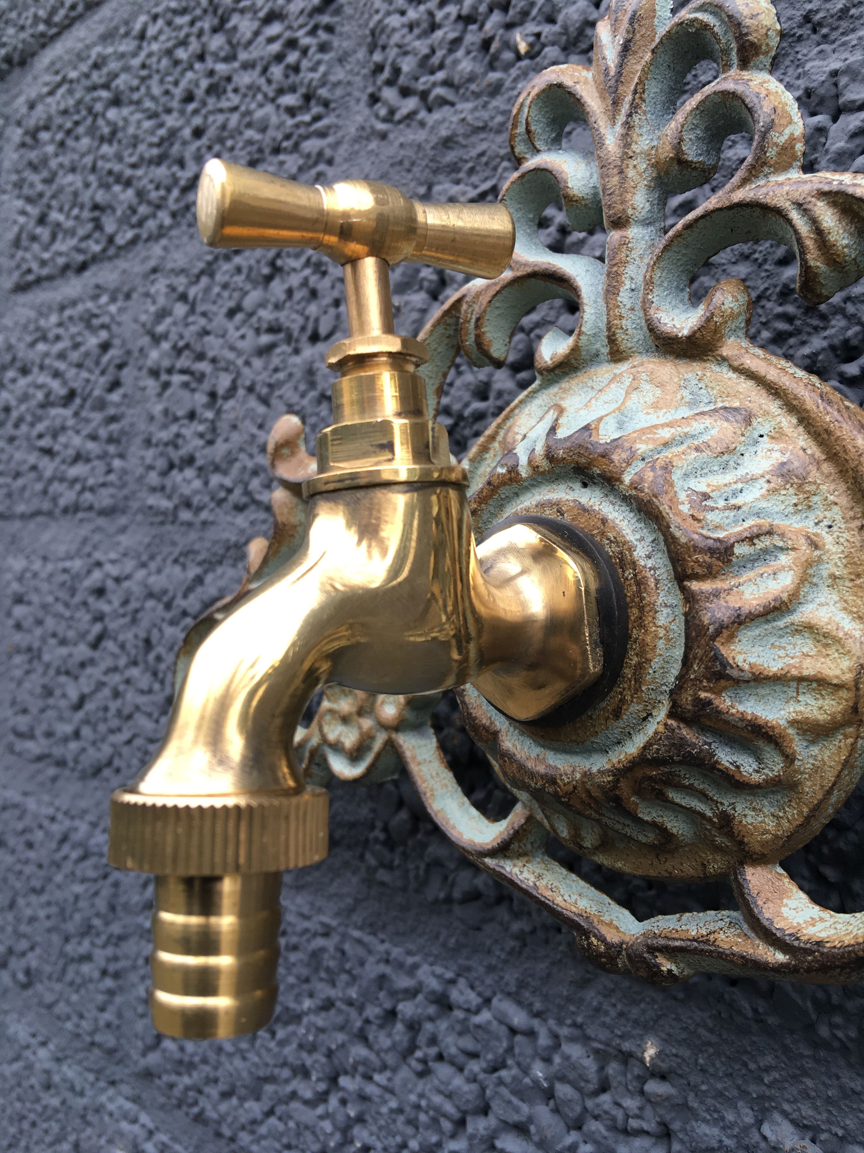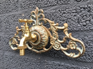 Wandfontein met kraan - messing=groen-bruin gietijzer.