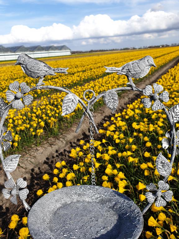 Dankzij de ketting van 20 cm hangt het vogelbadje en beschermt het tegen ongenode gasten. Het speciale verfproces geeft een antieke roest/grijze kleur met white wash.