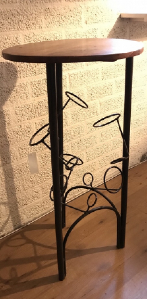 Een exclusieve wijn-bijzettafel, plek voor 6 flessen, gemaakt van ijzer en hout